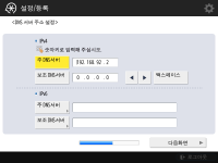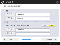 DNS 서버 주소, DNS 호스트 이름, DNS 도메인 이름을 지정합니다. ![]() ![]() <주 DNS서버>와 <보조 DNS서버>를 누르고, DNS 서버에 대한 IPV4/IPv6 주소를 입력한 후 <다음화면>를 누릅니다. DNS 서버 주소 설정에 대한 정보는 DNS 설정 구성을 참조하십시오. ![]() ![]() 기기 이름(호스트 이름)을 입력하려면 <호스트명>를 누릅니다. <도메인명>를 눌러 기기가 속한 도메인 이름을 입력한 후, <다음화면>를 누릅니다. IPv4 및 IPv6 설정이 같은 경우, <IPv4와 같은 호스트명/도메인명을 사용>를 위해 <설정>를 누릅니다. ![]() ![]() DNS 동적 업데이트 설정을 사용하여 자동으로 업데이트하려면 <DNS 동적 업데이트>를 위해 <설정>를 누른 후, <확인>를 누릅니다. <IPv6>를 위한 <DNS 동적 업데이트>를 <설정>에 설정하려면, 자동으로 등록할 항목을 위해 <설정>를 선택하십시오. | |