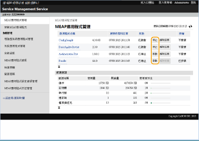 [MEAP應用程式管理]:已安裝之 MEAP 應用程式的管理工作,主要是在此頁面執行。