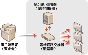 在使用 IEEE 802.1X 認證的網路環境中,未經授權的網路存取會遭區域網路交換器(認證者)封鎖,交換器只會將存取權限授予認證伺服器(RADIUS 伺服器)授權的用戶端裝置(請求者)。若要將本機連線到 IEEE 802.1X 網路,必須在本機上指定認證伺服器使用的認證方法等設定。指定這些設定必須要有管理員或網路管理員權限。