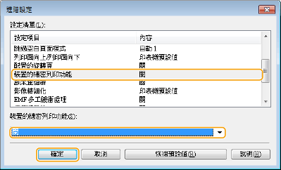 勾選 [裝置設定] 標籤上的 [裝置的機密列印功能] 核取方塊。