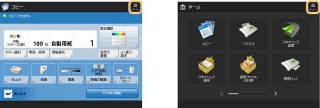 「ホーム」や基本画面に表示されている を押すと、ボタンの並べ替えやショートカット作成など、画面をカスタマイズすることができます。タッチパネルディスプレーをカスタマイズする![]() 「電源を入れた直後の画面」、「用紙やトナーの残量に関するメッセージ」など、画面表示に関する各種設定を変更することができます。<表示設定> 一定時間操作しなかったときに表示される画面を設定することができます。<オートクリア後の機能> |