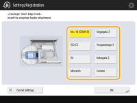 2 | Select the type of envelopes loaded in the paper drawer. When using custom size envelopes, press <Custom>  <Next>  enter the envelope dimensions. Press <X> or <Y>  use the numeric keys to enter the length of the respective dimension. |