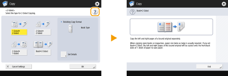 View the function guidePress <Tutorial> to display a screen that introduces what you can do with the functions of the machine as well as tips for using copy, scan, etc. View this screen when you want to learn more about what functions are available and how to use them. ![]() Example: Tutorial for Copy functions When you select an item from the list, the tutorial screen is displayed. ![]() Use the Help functionDepending on the function being displayed, is sometimes displayed on the upper-right of the screen. Press to check the description and operation method of the function.![]() Press <End> to return to the previous screen. Operate in the same manner as with a smartphone (flick/pinch/drag-and-drop)On some screens, you can switch the page or scroll by flicking your finger up/down or left/right on the screen as you would with a smartphone. ![]() You can also zoom in or out on the screen by using two fingers to pinch out or pinch in. You can drag the enlarged screen with your finger. Customizing the Screen Display Appearance and the Operational Conditions ![]() If <Enable Screen Magnification> is set to <On>, the entire screen is zoomed in/out when performing pinch operations on the preview screen. If <Enable Screen Magnification> is set to <Off>, only the preview image is zoomed in/out.