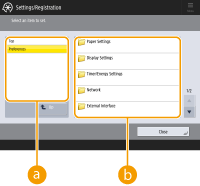(Settings/Registration) to display the <Settings/Registration> screen. Press this key first to make changes for each setting, such as paper settings, display settings, and network settings. On this screen, you can also register destinations, such as e-mail addresses and fax numbers.