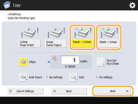 Depending on finishing functions, the installation of optional devices is needed. Optional Equipment<Saddle Stitch> can be set only if 2-Sided Copying is set. When configuring settings in <Access Stored Files>The finishing function can be used only when you are printing a PDF/XPS file or a file stored in the Mail Box. |