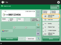 To check the total number of specified destinationsThe total number of specified destinations is displayed on the top right of the screen. This enables you to confirm that the number of destinations is correct before sending. ![]() To send with the sender informationYou can send with the sender's name and fax number. <TX Terminal ID> To check the statuses for sent documentsOn the <Status Monitor> screen, you can check the statuses for sent documents. This screen enables you to send faxes again or cancel sending after checking the statuses. Checking Status and Log for Sent and Received Documents When <Display Notification When Job Is Accepted> is set to <On>, the <Status Monitor> screen can be displayed from the following screen that is shown after a send job is received. <Display Notification When Job Is Accepted> ![]() When a transmission error occurs because the recipient's line is busyThe machine automatically redials after a certain period of time. You can change the settings such as how many times the machine redials and the interval between redials. <Auto Redial> To print the report for the results of sendingOn the Fax Basic Features screen, pressing <Options> <TX Report> enables you to set to automatically print the report listing the results of sending.To set this for each job from <Options>, it is necessary to select <For Error Only> or <Off> in <TX Report>, and then set <Allow Printing from Options> to <On>. When multiple sheets are fedScanning is stopped and the message is displayed on the screen. Follow the instructions to clear the jam. When you have cleared the jam, the resume job screen is displayed. If the machine mistakenly detects multiple sheet feeding, press <Do Not Detect Multi. Sheet Feed> to resume scanning. To set the machine in advance to not notify you of multiple sheet feeding, perform one of the following operations. Each time you send, press <Options> on the Fax Basic Features screen select <Detect Feeder Multi Sheet Fd.> to disable the setting. Set <Set Detection of Feeder Multi. Sheet Feed as Default> to <Off> (<Set Detection of Feeder Multi. Sheet Feed as Default>). When photos in the sent image are too dark or light colors in the background of color originals cannot be removedThe quality of the sent image may be able to be improved if the following conditions/settings are met. Job type: Fax (Memory Sending) or Scan and Send (Fax/I-fax) <Select Color>: <Black & White> (Scan and Send) <Original Type>: <Text> <Density> <Background Density>: <Auto><Resolution>: 200 dpi x 400 dpi, 300 dpi x 300 dpi*, 400 dpi x 400 dpi, or 600 dpi x 600 dpi* *Can be set for Scan and Send <Speed/Image Quality Priority for B&W Scan> Fax/I-Fax Send Jobs: <Quality Priority> (<Speed/Image Quality Priority for B&W Scan>)When multiple telephone lines are setYou can select the telephone line to use for sending faxes by pressing <Options> <Select Line>. For instructions on specifying fax line settings, see Fax Line Settings. |