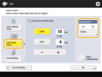 If you want to adjust the width for each border independently, press <Erase Original Frame> or <Erase Book Frame>, and then press <Adjust Independently> to enter the erasing widths. If you are using <Erase Binding>, the borders you do not select are also erased by 4 mm. |