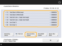 Press <Monitoring Service> <Communication Test> to check communication with the remote monitoring server. When this function is executed, information on the machine is periodically sent to the remote monitoring server. It is necessary to enable communication between the machine and the server providing the service in order to use this function.You can print a list that shows the number of pages used for copying, printing, scanning, and faxing. On this screen, you can also check the counter information for each MEAP application. Press <Check MEAP Counter> on the screen in step 2. If you press <Device Info./Other> <Check Device Configuration> on the same screen, you can check the options installed in the machine and the version of the security chip regarding HDD data encryption.For information on the count conditions, contact your local authorized Canon dealer. |
