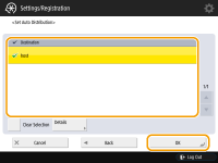 Distribution and update of device informationThe device information may not be distributed or updated when the client machine is processing other data. If a client machine is unable to receive the automatically distributed device information at the specified time, distribution is not performed again until the next specified time. Receiving device information from different Canon multifunction printer modelsWhen the machine is used as a client machine, it can receive device information from different Canon multifunction printer models by setting <Restrict Receiving Device Information> in <Receiving Settings> to <Off>. Note, however, that some of the information may not be distributed correctly. Selecting the functions to receive device information forWhen the machine is used as a client machine, you can restrict the functions to receive information for by setting <Restrict Receiving for Each Function> in <Receiving Settings> to <Off>. Restoring the previous device informationYou can perform operations on the client machine to restore the device information that existed before the update was performed. However, you can only restore the information that existed immediately prior to the update. Information older than that cannot be restored. Note also that the settings for <URL Send Settings> in <Set/Register Confidential Fax Inboxes> (<Set/Register Confidential Fax Inboxes>) may be erased if the data for <Settings/Regist. Value> and <Address Book> are not restored at the same time. <Device Management> <Device Information Distribution Settings> |