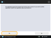 Registering from a Mobile Device or Google ChromeYou can register the machine from a mobile device or Google Chrome. Before registration is complete, the following confirmation screen will appear on the display of the machine. Press <Yes> to complete the registration. For information on registration methods, see the manual of your device or the Google Cloud Print home page. |