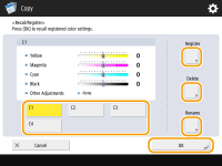 You can register up to four settings after adjustment. After adjusting the color, press <Recall/Register> select a button from <C1> to <C4> press <Register> <Yes> <OK>.![]() ![]() To recall registered settings, press <Recall/Register>, select a button, and press <OK>. You can change the button names of <C1> to <C4>. Select the button to change, press <Rename>, and enter a new name. To delete registered settings, select the button press <Delete> <Yes>. |