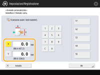 Premere <X> o <Y> per inserire la lunghezza di ciascun lato usando i tasti numerici. ![]() Se si registra il formato carta usato frequentemente sui pulsanti da <S1> a <S5>, è possibile richiamarlo tramite la pressione di un solo tasto. Registrazione della carta di formato libero (carta di formato personalizzato) | |