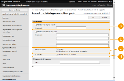 ![]() | È possibile visualizzare messaggi agli utenti sul pannello digitale. I messaggi possono essere visualizzati sul fondo del pannello digitale oppure in una finestra a comparsa separata, ed è possibile selezionare il metodo di visualizzazione da usare sulla base del tipo di messaggio o di utente. Quando un messaggio viene visualizzato in una finestra a comparsa, è possibile visualizzare lo stesso messaggio anche sulla pagina del portale IU remota. Sono necessari i privilegi di amministratore per configurare queste impostazioni. |