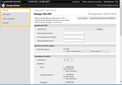 ![]() | Utilizzando la IU remota, è possibile stampare i file salvati su un computer o una rete direttamente dalla macchina senza utilizzare il driver stampante. Per stampare, non è necessario aprire i file nel computer. |