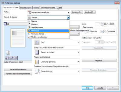 Selezionare [Memorizza] da [Metodo di stampa] e fare clic su [Sì].