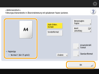 Wenn Sie Papierformat und -typ wechseln möchtenWenn Sie Papier eines anderen Typs in das Gerät einlegen, müssen Sie die Einstellungen ändern. Andernfalls kann das Gerät nicht richtig drucken. Angeben von Format und Typ des Papiers im Papiermagazin/ in der Papierkassette Wenn Sie das Papierformat wechseln, ersetzen Sie auch das Papierformatetikett entsprechend (Befestigen des entsprechenden Papierformatetiketts). Beachten Sie, dass das Papierformatetikett Papierformate enthalten kann, die auf dem Gerät nicht verfügbar sind. |