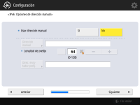 Especifique las opciones de la conexión de red. ![]() ![]() Pulse <Sí> para <Usar IPv4> o <Usar IPv6>, y pulse <Siguiente>. También puede utilizar IPv4 e IPv6. Si pulsa <No> para <Usar IPv4> y <Usar IPv6>, y pulsa <Aceptar>, omita las opciones de red y siga con el Paso 9. ![]() Si pulsa <Sí> para <Usar IPv4>, especifique las opciones siguientes. ![]() Para obtener la dirección IP automáticamente, pulse <DHCP> o <IP autom.>, y pulse <Siguiente> o <Aceptar>. Para configurar la dirección IP manualmente, quite la selección de <DHCP> o de <IP autom.>, pulse <Dirección IP>, <Máscara de subred> y <Dirección de puerta enlace> para introducir cada valor, y pulse <Siguiente> o <Aceptar>. Para obtener información sobre las opciones de la dirección IPV4, consulte Configurar una dirección IPv4. ![]() Si pulsa <Sí> para <Usar IPv6>, especifique las opciones siguientes. ![]() Pulse <Sí> para utilizar la dirección sin estado, o <No> para no utilizarla, y pulse <Siguiente>. Para obtener información sobre la dirección IPV6, consulte Configurar una dirección IPv6. ![]() Tras especificar la dirección sin estado, indique las opciones siguientes. ![]() Pulse <Sí> para utilizar la dirección manual, o <No> para no utilizarla, y pulse <Siguiente>. Para utilizar la dirección manual, pulse <Dirección manual>, <Longitud de prefijo>, y <Direc. enrutador prefij.> para introducir cada valor. ![]() Tras especificar la dirección manual, indique las opciones siguientes. ![]() Pulse <Sí> para utilizar DHCPv6 o <No> para no utilizar DHCPv6, y pulse <Aceptar>. | |