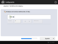 Especifique las opciones necesarias para utilizar la función de fax. ![]() Si el producto opcional necesario para enviar por fax (Opciones del sistema) no está instalado, siga con el Paso 10. Seleccione el país/región si aparece la pantalla de selección, y pulse <Siguiente>. ![]() ![]() Introduzca el número de fax y pulse <Siguiente>. Para obtener información sobre las opciones del fax, consulte Opciones de línea de fax. ![]() ![]() Pulse <Establecer>, introduzca el nombre de usuario y pulse <Siguiente>. ![]() ![]() Seleccione el tipo de línea y pulse <Aceptar>. | |