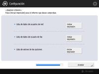 Puede imprimir la lista de usuarios de la red, la lista de datos de usuarios de fax y la lista de valores ajustados. ![]() ![]() Pulse <Iniciar impresión> para el informe que desee imprimir. Una vez finalizada la impresión, o si no desea imprimir una lista, pulse <Aceptar>. | |