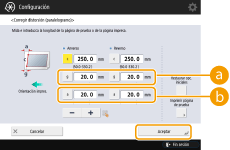 3 | Introduzca los valores <g> y <a> para los lados delantero y derecho pulse <Aceptar>.![]() <g>Introduzca la longitud medida de la marca <g> en la página de prueba. <a>Introduzca la longitud medida de la marca <a> en la página de prueba. Siguiendo el ejemplo, introduzca 20,5 para <g> y 21,0 para <a>. La diferencia entre <g> y <a> (0,5 mm) se corregirá de forma automática. |