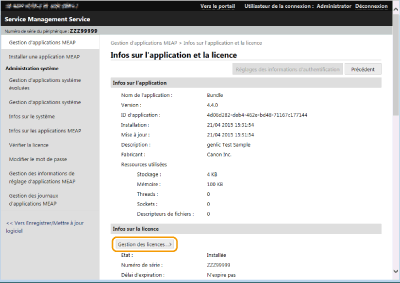 Cliquez sur [Gestion des licences] pour exécuter l'opération souhaitée.