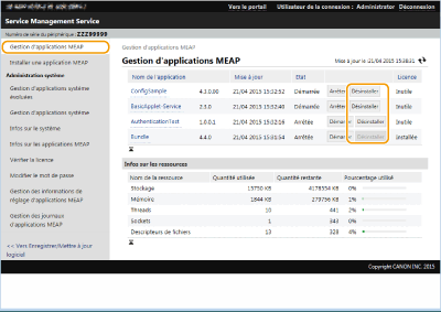 1 | Cliquez sur [Gestion d'applications MEAP] [Désinstaller] en regard de l'application à désinstaller.![]() |