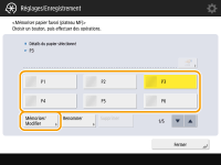 Si vous utilisez un format et un type de papier spécifiques dans le plateau multifonctions, vous pouvez enregistrer le papier à l'avance en tant que « Papier favori » du plateau multifonctions. Le « Papier favori » peut facilement être sélectionné à partir de l'écran qui s'affiche lorsque vous chargez le papier dans le plateau multifonctions. Vous gagnez ainsi du temps à chaque fois que vous devez utiliser le papier en question.