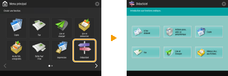 Affichage du guide de fonctionnementAppuyez sur <Didacticiel> pour afficher un écran vous présentant les fonctions de l'appareil et vous donnant des conseils au sujet de la copie ou encore de la numérisation. Consultez cet écran si vous souhaitez en savoir plus sur la disponibilité et l'utilisation des fonctions. ![]() Exemple : didacticiel des fonctions de copie Si vous sélectionnez un élément de la liste, l'écran du didacticiel s'affiche. ![]() Utilisation de la fonction d'aideSelon la fonction affichée, apparaît dans la partie supérieure droite de l'écran. Appuyez sur pour consulter la description et le mode d'emploi de la fonction.![]() Appuyez sur <Fin> pour revenir à l'écran précédent. Fonctionnement similaire à celui d'un smartphone (balayage, pincement, glisser-déposer)Dans certains écrans, vous pouvez passer d'une page à une autre ou faire défiler l'écran en effectuant un mouvement de balayage avec votre doigt, vers le haut, le bas, la gauche ou la droite, comme vous le feriez avec un smartphone. ![]() Vous pouvez également agrandir ou réduire l'écran en effectuant un mouvement de pincement avec les deux doigts. Vous pouvez aussi déplacer l'écran agrandi avec votre doigt. Personnalisation de l'apparence de l'écran affiché et des conditions de fonctionnement ![]() Si <Activer Zoom écran> est défini sur <Oui>, un zoom avant/arrière est effectué sur tout l'écran lorsque vous écartez ou rapprochez les doigts sur l'écran d'aperçu. Si <Activer Zoom écran> est défini sur <Non>, le zoom avant/arrière est effectué sur l'image d'aperçu uniquement.