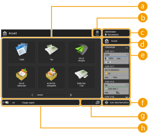 Cette section décrit les éléments affichés dans l'écran <Accueil>.