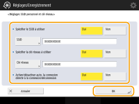 Appuyez sur <Réglages SSID personnel et clé réseau>, spécifiez un SSID personnel et une clé réseau, puis appuyez sur <OK>.