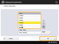Appuyez sur <Changer langue/clavier>, sélectionnez une langue dans la liste et appuyez sur <OK>.