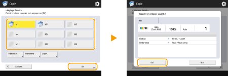 Pour les fonctions « Copier » et « Numériser et envoyer », vous pouvez également configurer l'appareil afin de ne pas afficher l'écran de confirmation lors du rappel des paramètres enregistrés.