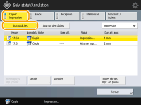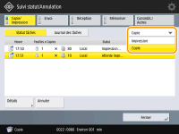 Si vous appuyez sur (Stop) sur le panneau de commande alors que des tâches de copie sont en attente, toutes les tâches de copie sont interrompues, puis le message <<Arrêt>Choisir la tâche de copie à annuler.> et la liste des tâches de copie s'affichent. Vous pouvez sélectionner une tâche de copie dans la liste et l'annuler en appuyant sur <Annuler>. Pour reprendre la copie, appuyez sur <Reprendre copie>. |