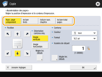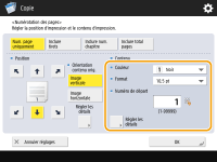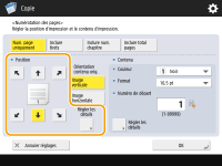 Les numéros et les symboles ne sont pas imprimés sur les couvertures (Ajout d'une couverture et d'un verso) ou les feuilles insérées (Insertion de feuilles et de pages de chapitre (feuilles insérées)). Les numéros de jeux de copies sont imprimés sur toutes les pages copiées. Les numéros de jeux de copies peuvent être imprimés avec des dates ou du texte. <Réglages d'impression> <Régl. options numérot. jeux de copies>Le texte pour la <Numérotation des pages> et le <Filigrane> peut également être sélectionné à partir du texte qui a été enregistré dans <Enreg. caractères pour Num. pgs/Filigrane>. Si vous sélectionnez deux options parmi <Numérotation des pages>, <Filigrane>, <Date d'impression> et <Numérotation jeux copies> pour imprimer dans la même position, un message vous demandant si vous voulez imprimer avec ces réglages s'affiche lorsque vous appuyez sur (Start).Si vous sélectionnez <Inclure num. chapitre> en combinaison avec <Intercalaires>, les numéros de chapitre sont comptés aux occurrences suivantes : Après l'insertion de chaque page de chapitre Après l'insertion de chaque insertion de feuille Si vous définissez <Régl. options numérot. jeux de copies> sur <Oui>, les réglages que vous pouvez modifier changent comme suit. <Régl. options numérot. jeux de copies> Vous ne pouvez plus sélectionner <Toute la surface> et <Numéros à 5 endroits> comme positions d'impression dans le mode Numérotation des jeux de copies. Les tailles de numéro du mode Numérotation des jeux de copies deviennent <10,5 pt>, <12,0 pt> et <14,0 pt>. |