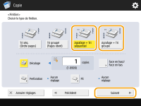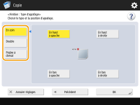 Pour certaines fonctions de finition, vous devrez installer des équipements disponibles en option. Equipement optionnelL'option <Piqûre à cheval> ne peut être définie que si la Copie recto verso est définie. Lors de la configuration des réglages dans <Accès aux fichiers enregistrés>La fonction de finition peut uniquement être utilisée lorsque vous imprimez un fichier PDF/XPS ou un fichier stocké dans la boîte aux lettres. |