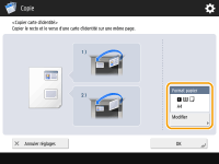 Si un autre original est placé dans le chargeur, vous ne pouvez pas lancer la copie. Enlevez cet original du chargeur. Les formats de papier suivants peuvent être utilisés pour <Copier carte d'identité>. machines de 208 V et de 120 V : LTR et LTRR machine de 230 V : A4 ou A4R |