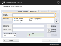 Vous pouvez aussi afficher l'écran <Réglages de transfert> en appuyant sur <Réglages dest./transfert>(Écran <Accueil>) <Réglages de transfert>. |