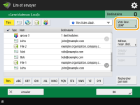 Liste déroulante pour la sélection de types de Carnet d'adressesVous permet d'afficher un groupe spécifique de destinataires. Quand vous êtes connecté à l'appareil avec la gestion de l'authentification personnelle, vous pouvez sélectionner <Liste d'adresses personnelle> pour afficher votre carnet d'adresses personnel.