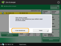Si vous envoyez un I-fax à une destination qui n'est pas compatible avec le mode transmission, l'écran <Status Monitor> affiche <Attente résultat...> même si la transmission est terminée. Cela continue à s'afficher jusqu'au moment défini dans <Temporisation TX mode intégral>.