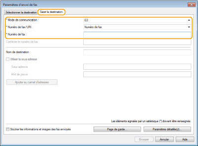 Cliquez sur l'onglet [Saisir la destination], et spécifiez le mode de communication et le numéro de fax que vous utilisez.