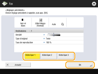 Appuyez sur <Réglages précédents> sur l'écran des fonctions de base de la fonction Fax.