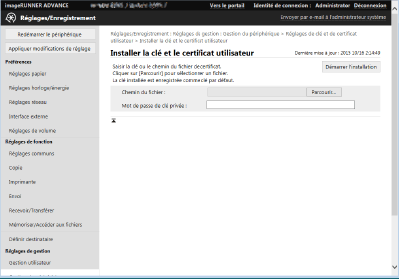 Cliquez sur [Gestion du périphérique]  [Réglages de clé et de certificat utilisateur].