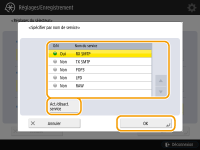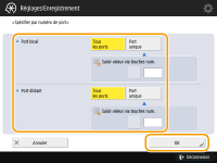 3 | Spécifiez le port auquel appliquer IPSec. Appuyez sur <Spécifier par n° de port> pour utiliser des numéros de port pour spécifier les ports auxquels appliquer IPSec. Sélectionnez <Tous les ports> pour appliquer IPSec à tous les numéros de port. Pour appliquer IPSec à un numéro de port spécifique, appuyez sur <Port unique> et saisissez le numéro de port. Une fois les ports spécifiés, appuyez sur <OK>. Spécifiez le port de cet appareil dans <Port local>, et spécifiez le port de l'homologue de communication dans <Port distant>. ![]() Appuyez sur <Spécifier par nom de service> pour utiliser les noms de service pour spécifier les ports auxquels appliquer IPSec. Sélectionnez le service dans la liste, appuyez sur l'option <Act./désact. service> pour la régler sur <Oui>, et appuyez sur <OK>. ![]() | ||||||||||||||
