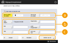 Gestion des clés et des certificatsVous pouvez vérifier les réglages détaillés ou supprimer des clés et des certificats sur l'écran qui s'affiche lorsque vous appuyez sur (Settings/Registration) <Réglages de gestion> <Gestion du périphérique> <Réglages de certificat> <Liste de clés et de certificats>. Si la liste des clés et des certificats ne s'affiche pas, appuyez sur <Liste clés et certif. pour ce périphérique> pour l'afficher.Si Si Si vous sélectionnez une clé et un certificat et appuyez sur <Détails du certificat>, des informations détaillées sur le certificat s'affichent. Vous pouvez aussi appuyer sur <Vérifier cert.> sur cet écran pour vérifier si le certificat est valide. Pour supprimer des clés et des certificats, sélectionnez les éléments à supprimer, puis appuyez sur <Supprimer> <Oui>. |