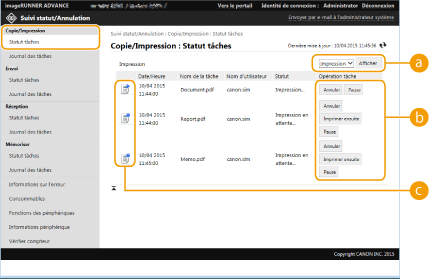 Vous pouvez vérifier les statuts des fax et des e-mails qui sont en attente pour être envoyés, des fax qui ont été reçus et des fax en attente de transmission. Vous pouvez aussi annuler le processus d'envoi et de réception des documents.