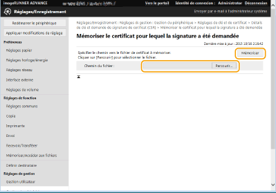Cliquez sur [Parcourir...], spécifiez le fichier (certificat) à enregistrer et cliquez sur [Mémoriser].