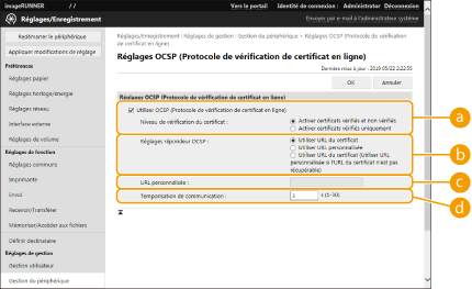 Il y a deux méthodes pour vérifier si les certificats reçus lors d'une communication avec un tiers sont valides : par comparaison avec la liste de révocation de certificat (CRL) enregistrée sur l'appareil et par interrogation d'un répondeur OCSP (online certificate status protocol) (pour un serveur prenant en charge OCSP). Définissez la méthode de vérification de la validité des certificats en fonction de votre environnement. Seul l'administrateur peut effectuer cet enregistrement.