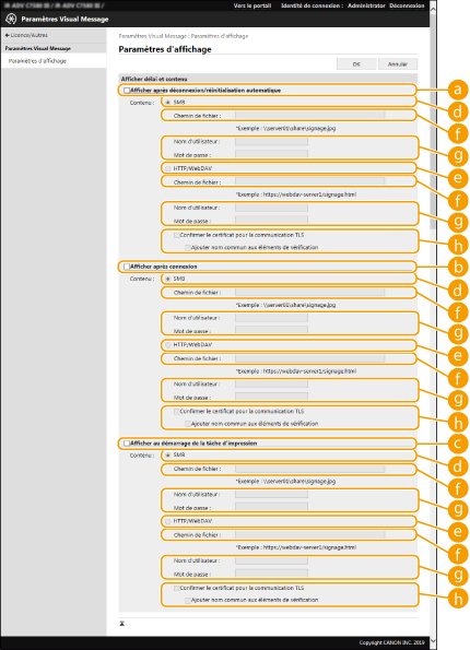 Pour afficher le contenu une fois le mode de réinitialisation automatique démarré, réglez <Délai réinitialisation auto.> sur une minute ou plus. Pour plus d'informations sur les formats de fichier et les tailles de données qui peuvent être affichés, consultez la section Fonctions de gestion. Ces réglages ne peuvent être définis que par un utilisateur qui dispose des droits administrateur. Ce réglage n'est pas inclus dans la Distribution des informations de périphérique. Diffusion des informations de périphérique vers d'autres imprimantes multifonctions Canon Ce réglage peut être importé/exporté. Le même réglage peut être importé vers plusieurs dispositifs (uniquement des dispositifs Canon prenant en charge la fonction Visual Message) pour afficher le même avis ou les mêmes informations sur plusieurs dispositifs.Import/Export des données de réglage [Chemin de fichier :] est importé/exporté avec ce réglage. Si un fichier dans l'Boîte avancée est spécifié et affiché sur l'appareil exportateur, exécutez l'une des opérations suivantes : Copiez manuellement le fichier dans l'Boîte avancée de l'appareil exportateur vers l'Boîte avancée de l'appareil importateur. Remplacez le [Chemin de fichier :] par le chemin d'emplacement du fichier. Si vous exécutez des opérations de connexion, exécutez-les après avoir quitté l'écran Visual Message. Connexion à l'appareil Si Lecteur de Carte est installé, le contenu n'est pas affiché. |