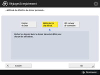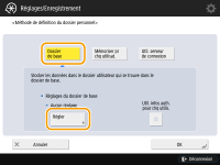 <OK>. Chaque utilisateur peut spécifier l'emplacement de son dossier personnel.1 | Appuyez sur <Dossier de base> <Régler>.![]() |