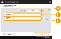 2 | Spécifiez le dossier de base et appuyez sur <OK>. ![]() <Protocole>Sélectionnez le protocole à utiliser pour accéder aux dossiers personnels. <Nom d'hôte>Saisissez le nom d'hôte ou l'adresse IP de l'ordinateur où vous voulez créer le dossier de base. <Chemin du dossier>Saisissez le chemin d'accès au dossier de base. Par exemple, saisissez "utilisateurs\public\partagé" pour un dossier de base créé dans un sous-dossier nommé "Partagé" dans le dossier "Public" sur le lecteur C : (chemin : "C:\utilisateurs\public\partagé"). ![]() Il est possible que vous ne puissiez pas spécifier le chemin d'accès s'il y a trop de niveaux de dossier. |